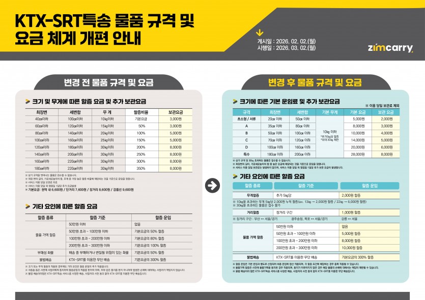 KTX-SRT특송 | [KTX-SRT특송]물품 규격 및 요금 체계 개편 안내 26-02-02 13:30 관련링크 KTX-SRT특송 물품 규격 및 요금 체계 개편 안내게시일 : 2026-02-02시행일 : 2026-03-02 다음글 [KTX-SRT특송]26년 2월 미운영 매장 안내 댓글목록 등록된 댓글이 없습니다. 목록보기